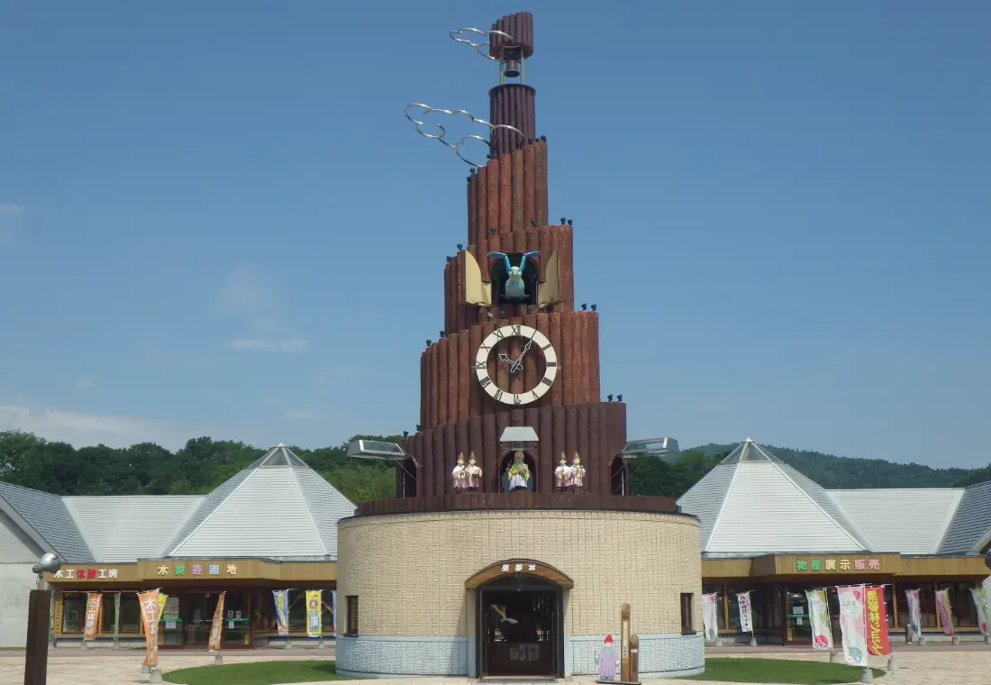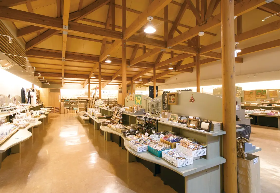併設する特産品販売所「果夢林ショップ」では、ハッカ製品や地元の木工品、農産加工品が豊富に揃います。広々とした店内でお土産の購入が可能。山の水族館や果夢林タワー(からくりハト時計)に隣接しています。